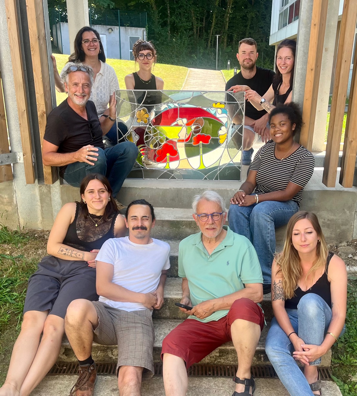 Déjà venu en Février, il a passé ce jeudi 19 juin 2025 au Lycée le Mas Jambost. Stagiaires, formateurs et l’artiste ont finalisé l’ouvrage qui était préassemblé : ils ont rabattu et soudé les plombs, et procédé au masticage de la pièce qui est la dernière étape. Mais avant Jean Luc a signé en gravant le verre :